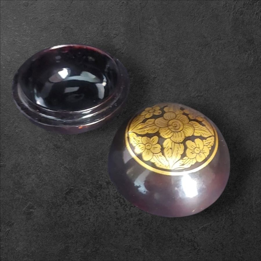Vintage purple wood trinket box with a decorative floral design on the lid.