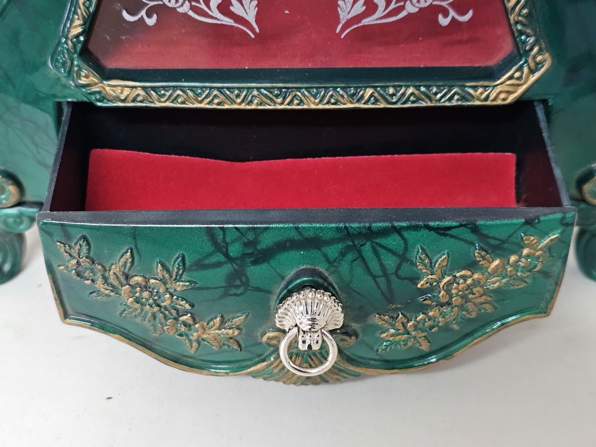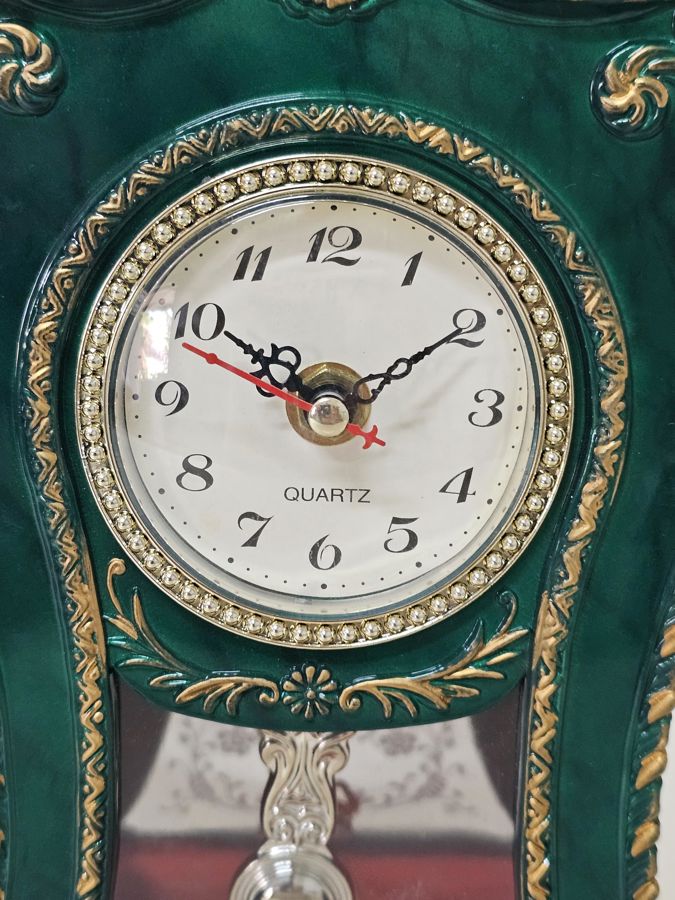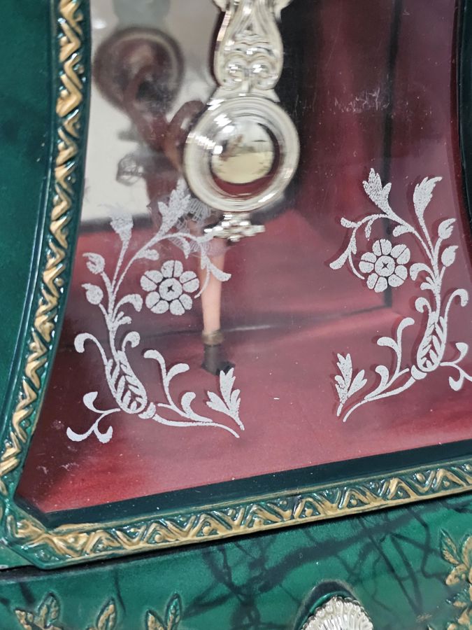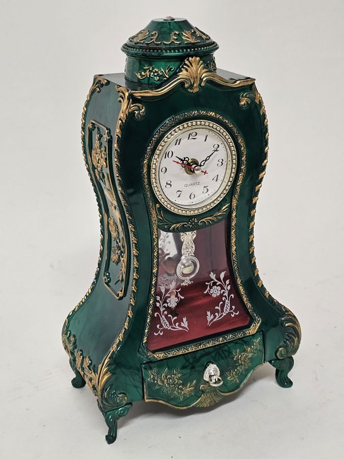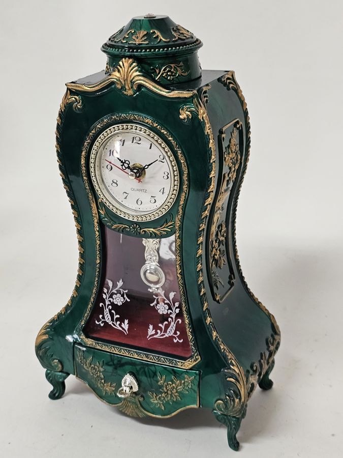 Vintage (1980's) French style, 4-footed Resin Quartz tabletop Clock with draw -Deep green and gold