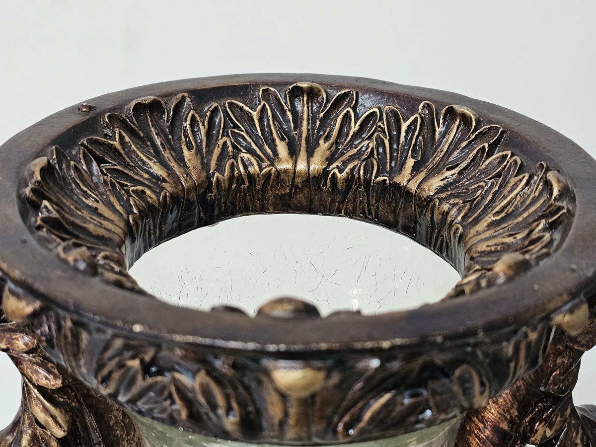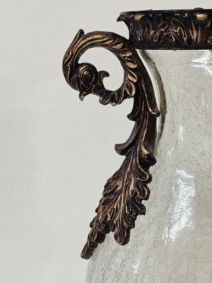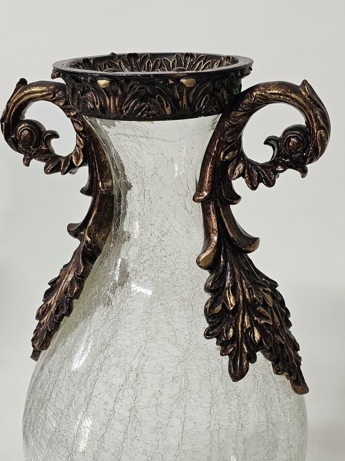 Captivating Large Crackle Glass Vase with bronze toned accents and handles.