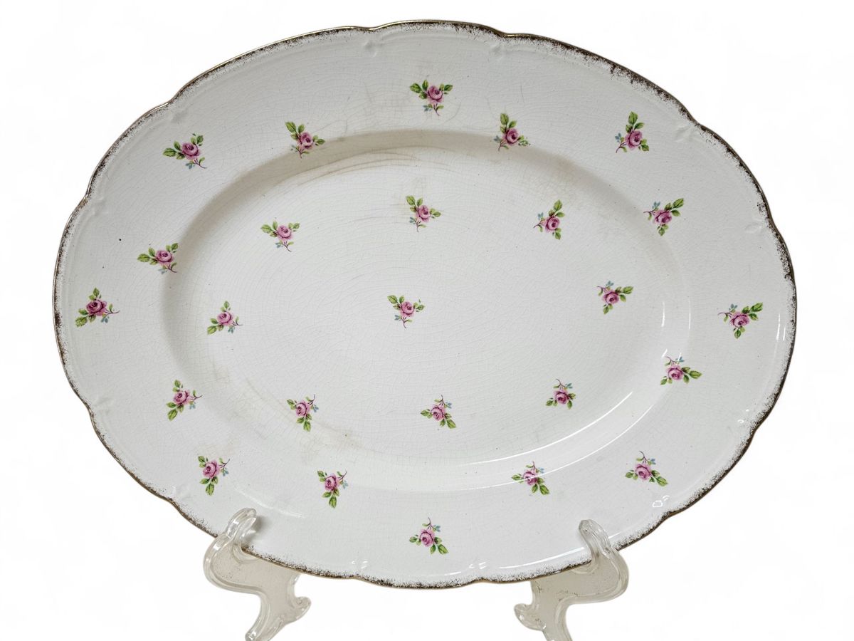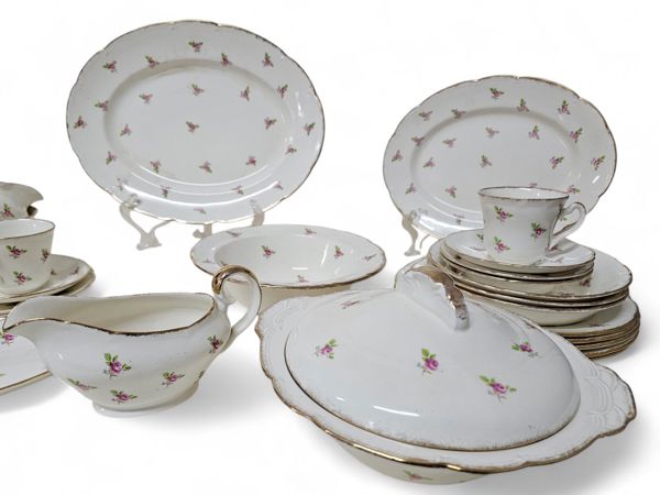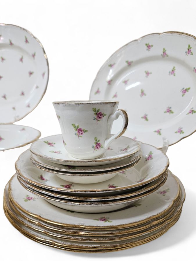 1 Tea Pot Sugar Bowl and Creamer . 4 Trios . 1 Serving Dish with Lid . 1 Gravy Boat with Saucer . 1 Round Dish . 2 Protein Plates . Batch of assorted Plates Extra . Glaze Crackling and age related Staining