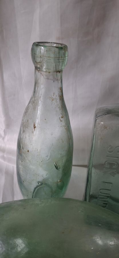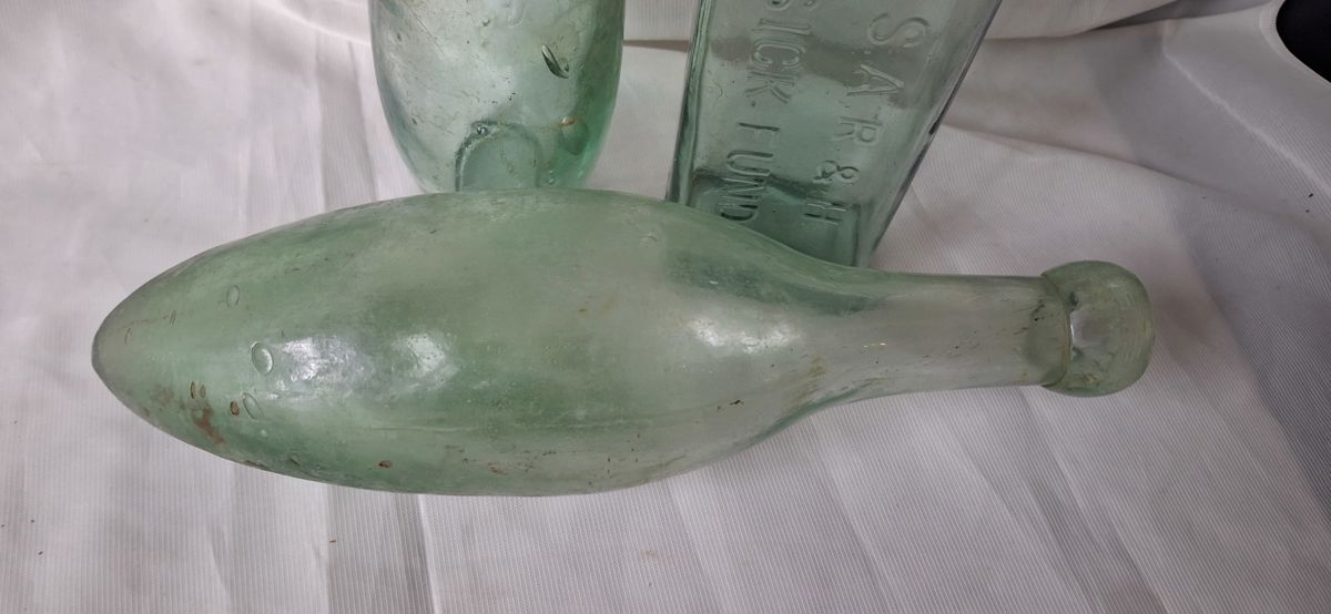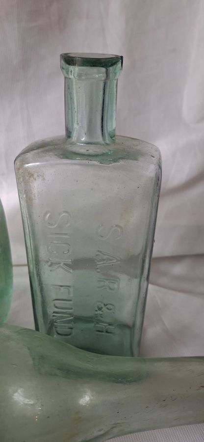 Details: Includes one round-bottom bottle, one square-shaped bottle with "S AR & H SICK FUND" embossing, and one tapered bottle