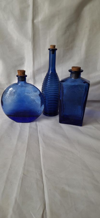 Set of three blue glass bottles with cork stoppers.