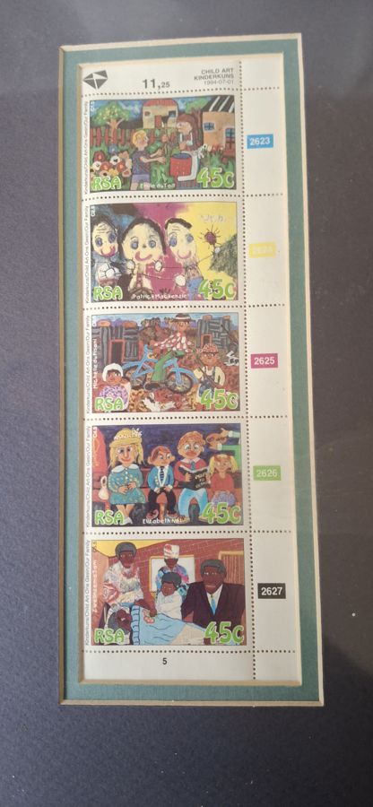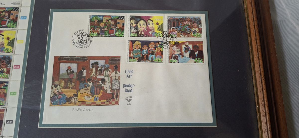 Contents: Set of colorful stamps depicting children's art, along with a first-day cover envelope featuring related artwork.