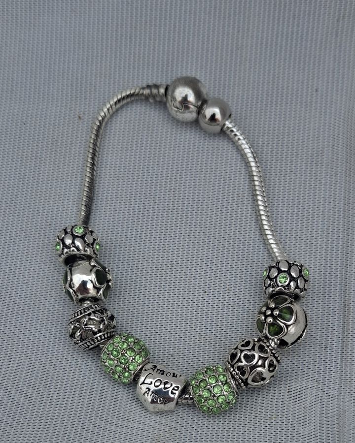 Silver charm bracelet featuring interchangeable beads with green stone accents.
