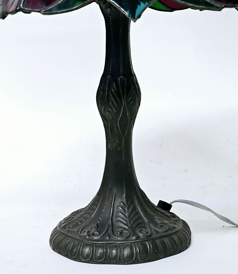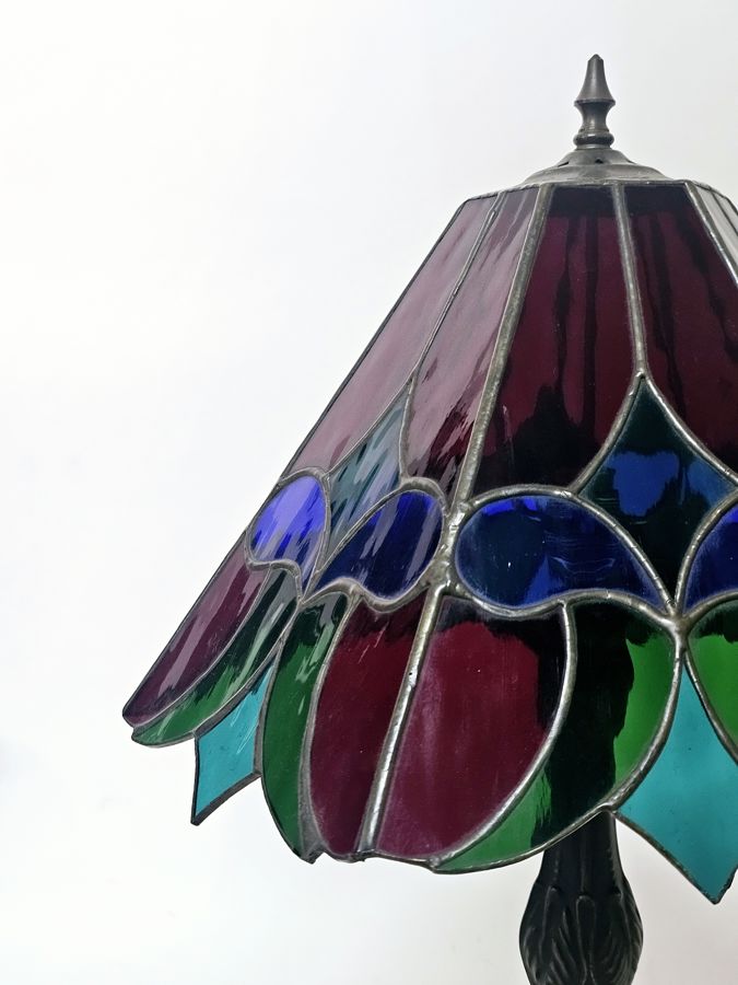 Elegant Tiffany-style lamp featuring a stained glass shade in rich tones of purple, green, and blue. Mounted on a detailed metal base with ornate leaf and scroll patterns.