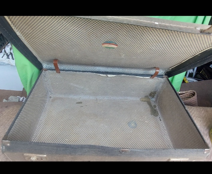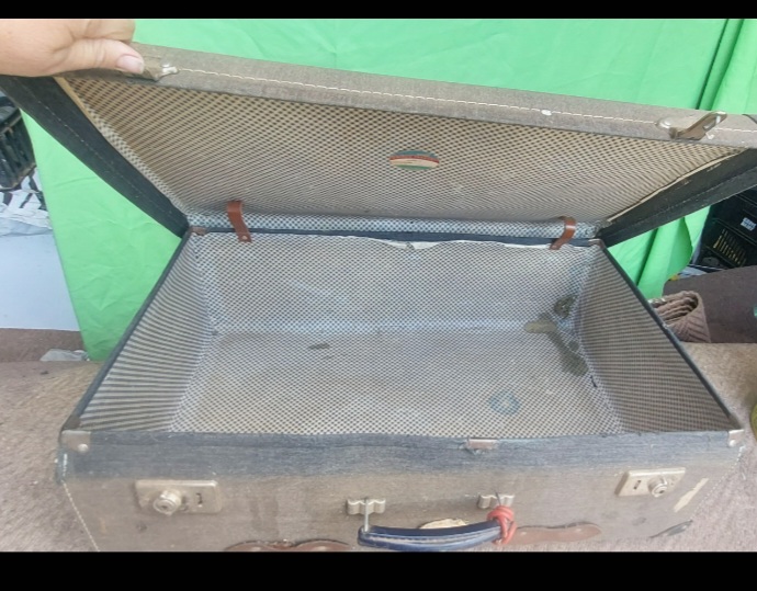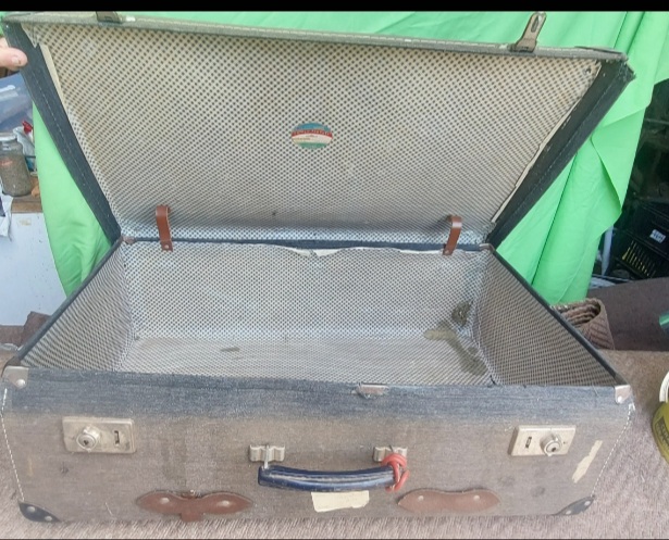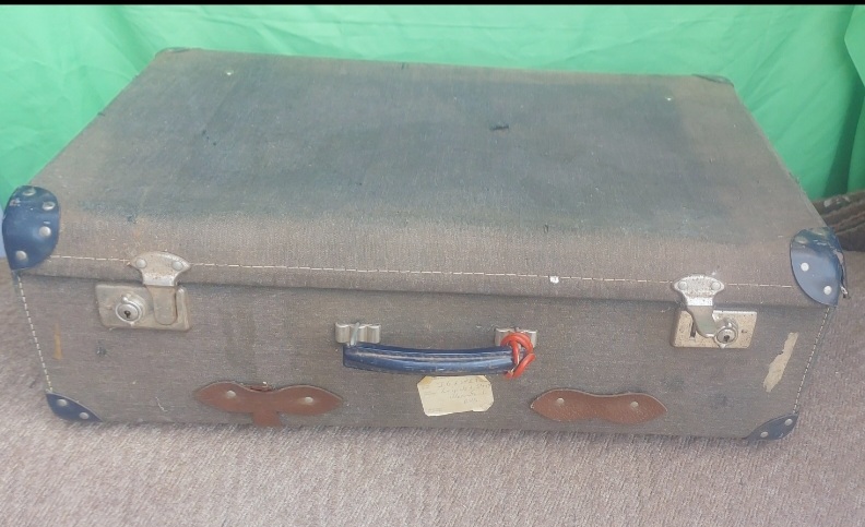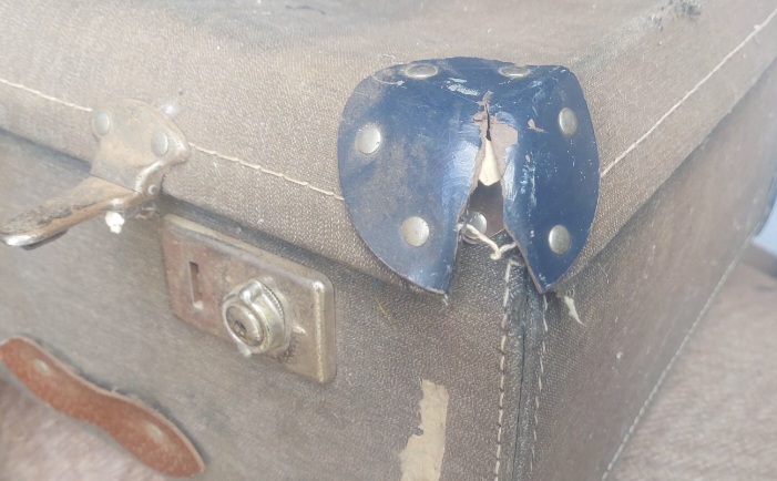 Vintage canvas suitcase featuring leather trim and metal corner protectors.