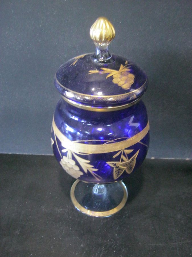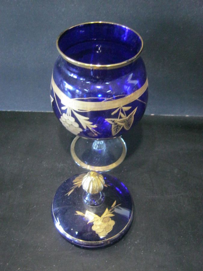 BOHEMIAN COBALT BLUE PEDESTAL JAR, Etched Grape Design with Gilding, 23cm Overall Height