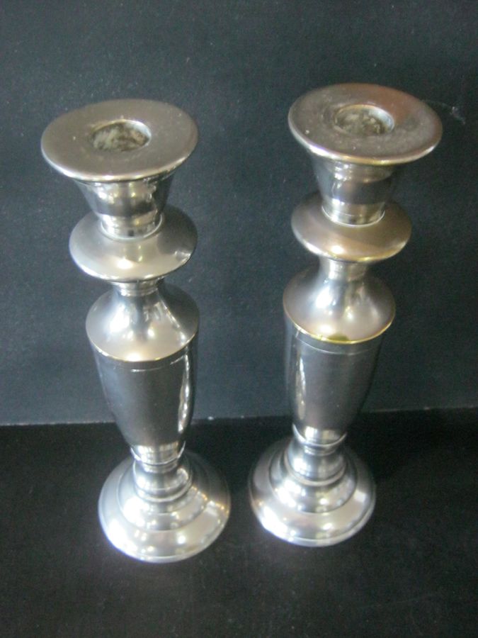 PAIR OF SILVER PLATED PILLAR CANDLESTICKS, 28cm Tall, Base to one Loose