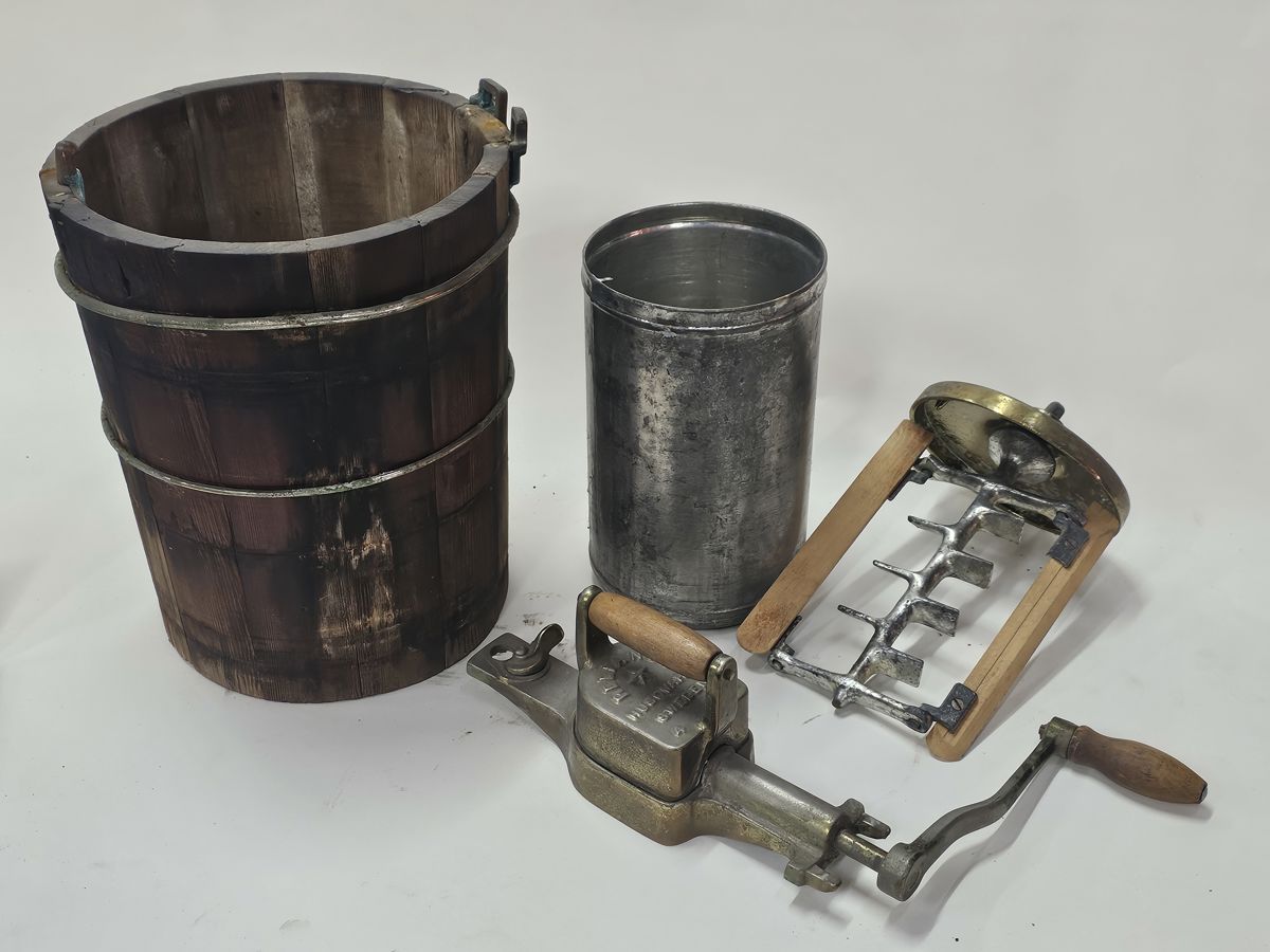 a classic wooden bucket ice cream maker with a hand-crank mechanism. The device has a rustic wood finish and a metal churning apparatus, making it a functional collectible and a charming piece of Americana. Perfect for a vintage kitchen display, historical enthusiast, or anyone looking to make homemade ice cream the traditional way.