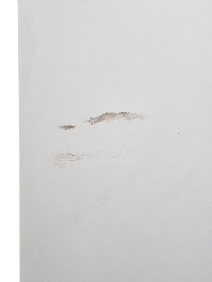 The exterior of the wardrobe shows signs of wear and tear, including scuffs and small areas where the paint is chipped, consistent with use