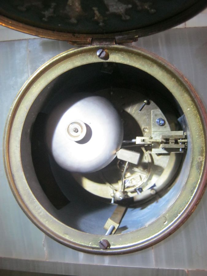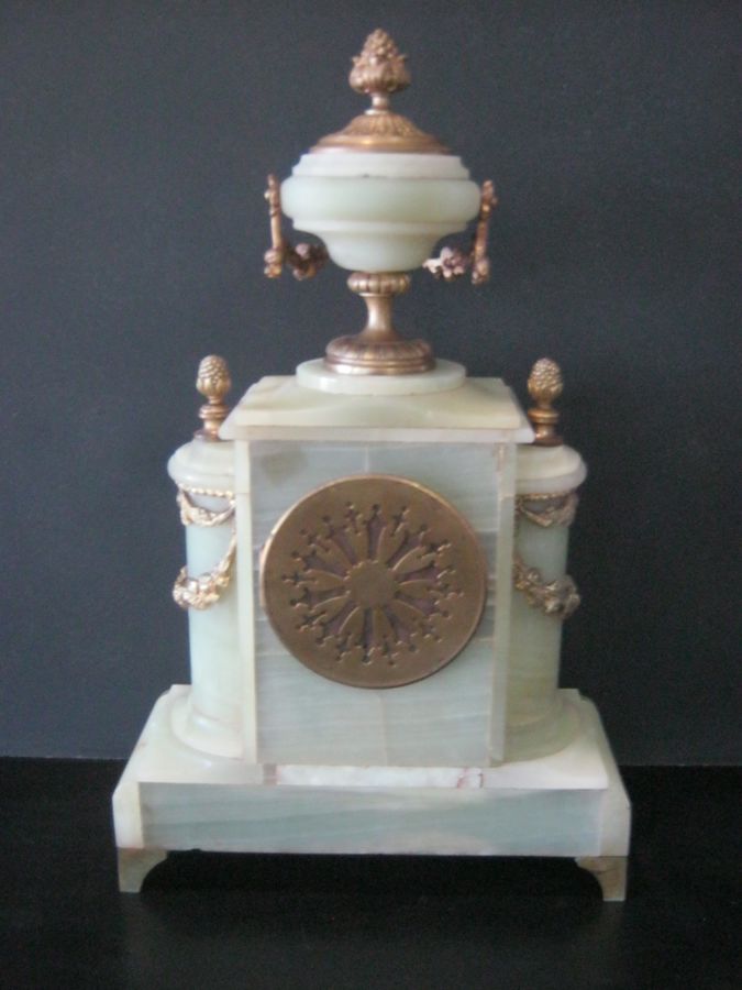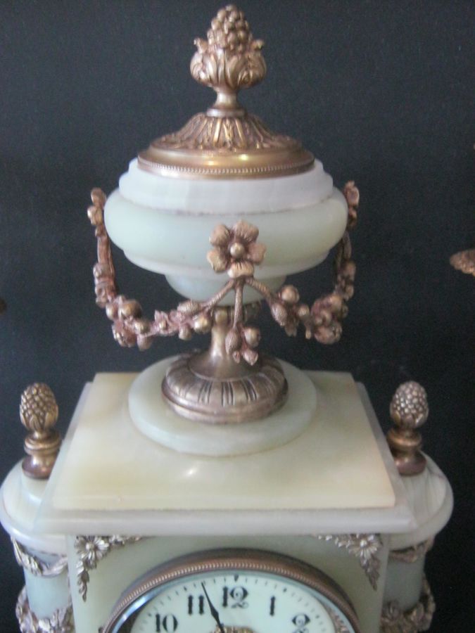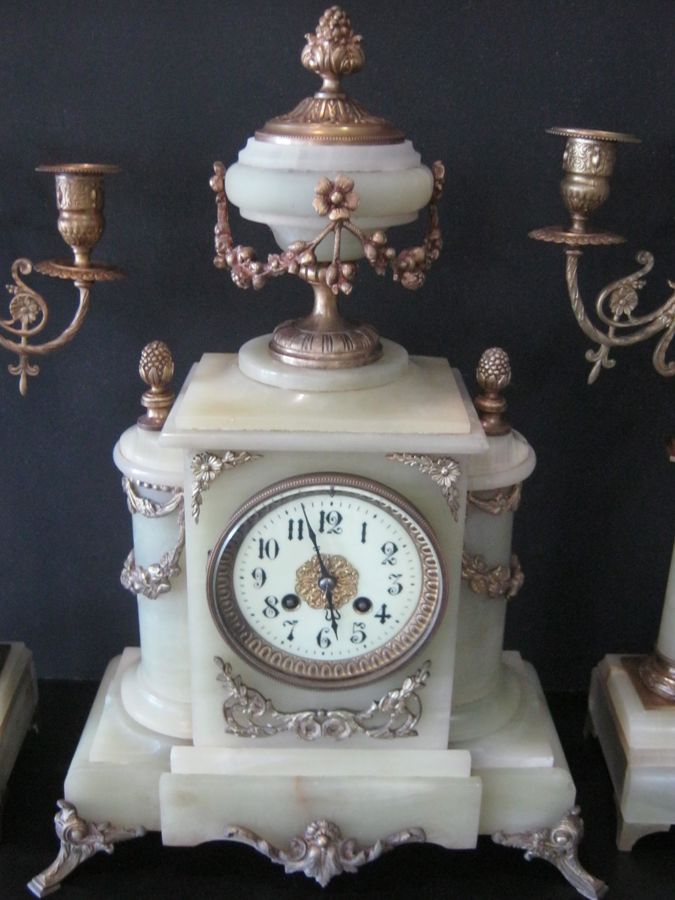 19thC GREEN ONYX AND GILT BRONZE GARNITURE SET, Louis XVI Style Clock and Pair of 5 Arm Candelabra, Working Clock with Key, Height of Clock 47cm, Height of Candelabra 51cm