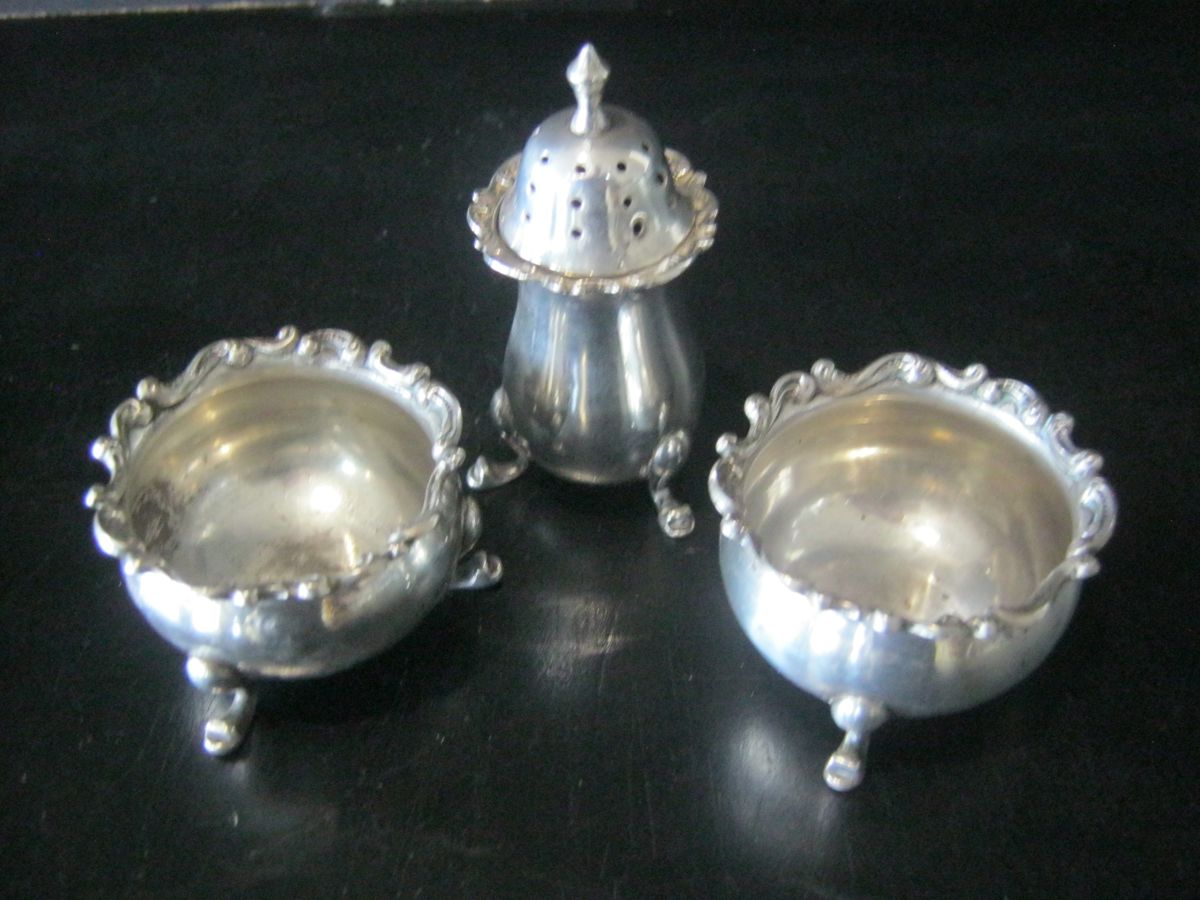 STERLING SILVER CRUET SET, 2 x Open Salts and Pepper Shaker, Birmingham 1900, 77g
