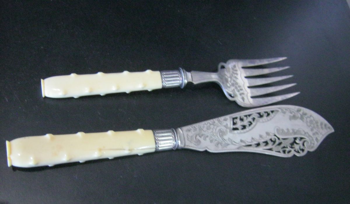 SILVER PLATED FISH SET WITH CARVED BONE HANDLES, Fish Serving Fork and Slice, 5 x Fish Knives and Forks