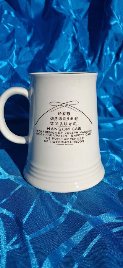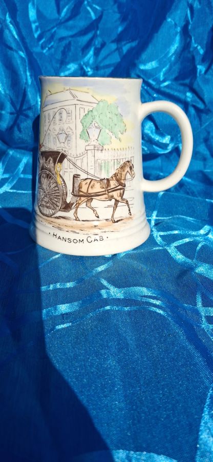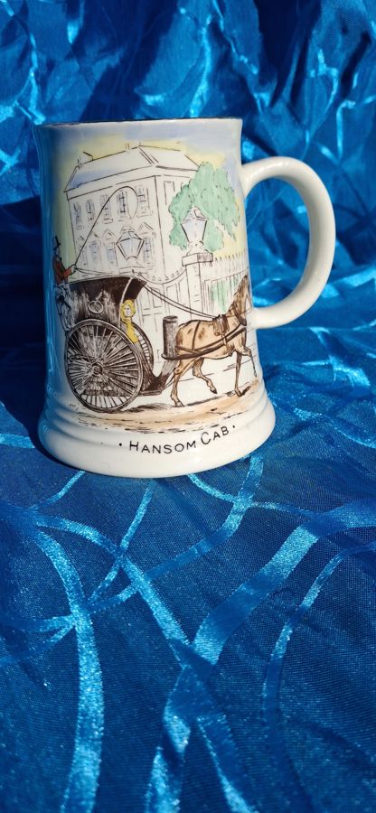 Vintage English beer mug featuring a "Hansom Cab" design.