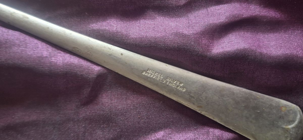 Antique nickel silver ladle with a long handle and marked "Nickel Silver Made in England."