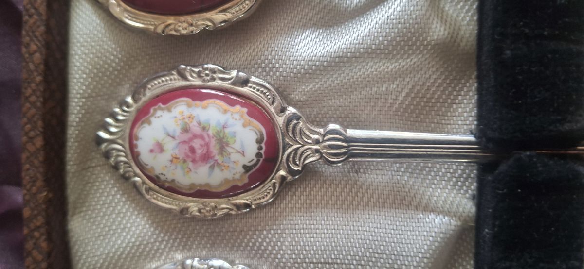Set of 3 vintage silver-plated teaspoons with floral enamel design.