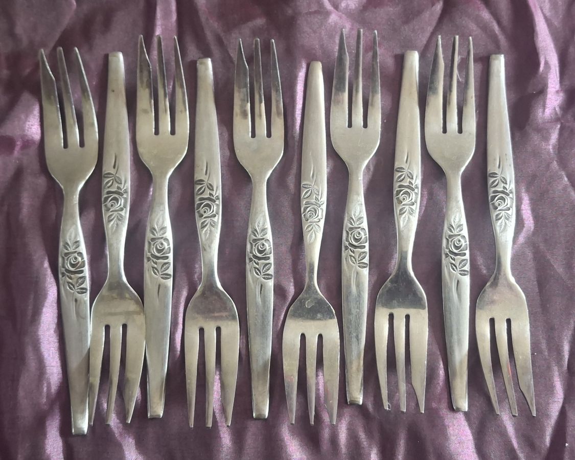 Set of 8 vintage stainless steel forks with floral design on handles.