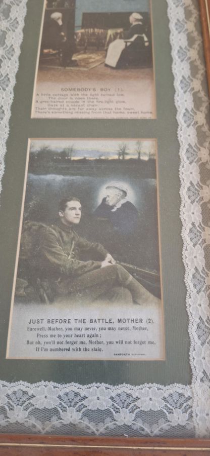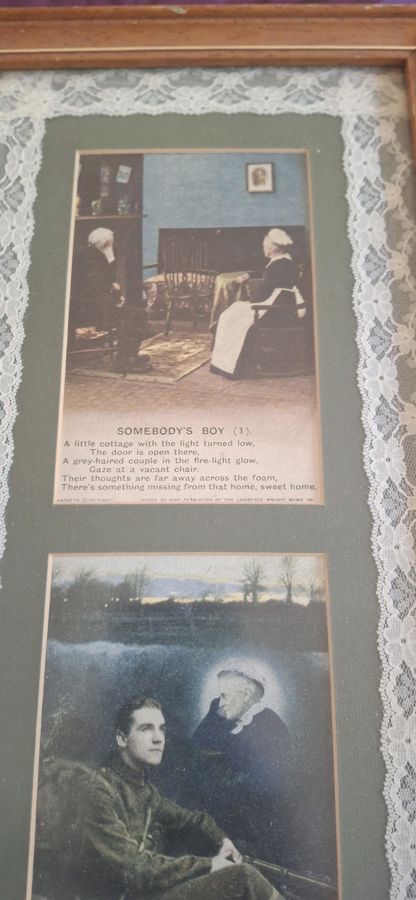 Framed vintage postcard set featuring two early 20th-century postcards, "Somebody's Boy" and "Just Before the Battle, Mother."