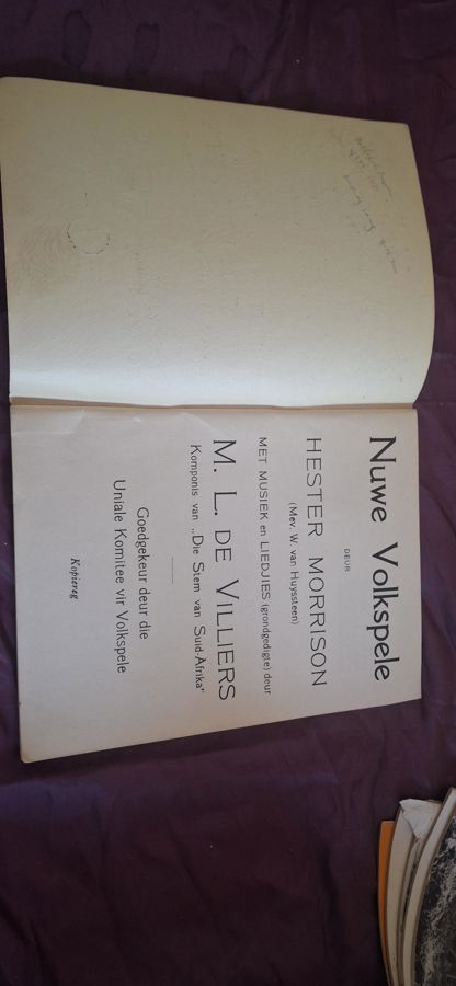"Nuwe Volkspele" by Hester Morrison, featuring music and songs composed by M. L. de Villiers. Approved by the National Committee for Folk Games. In good condition, containing Afrikaans folk games and songs.