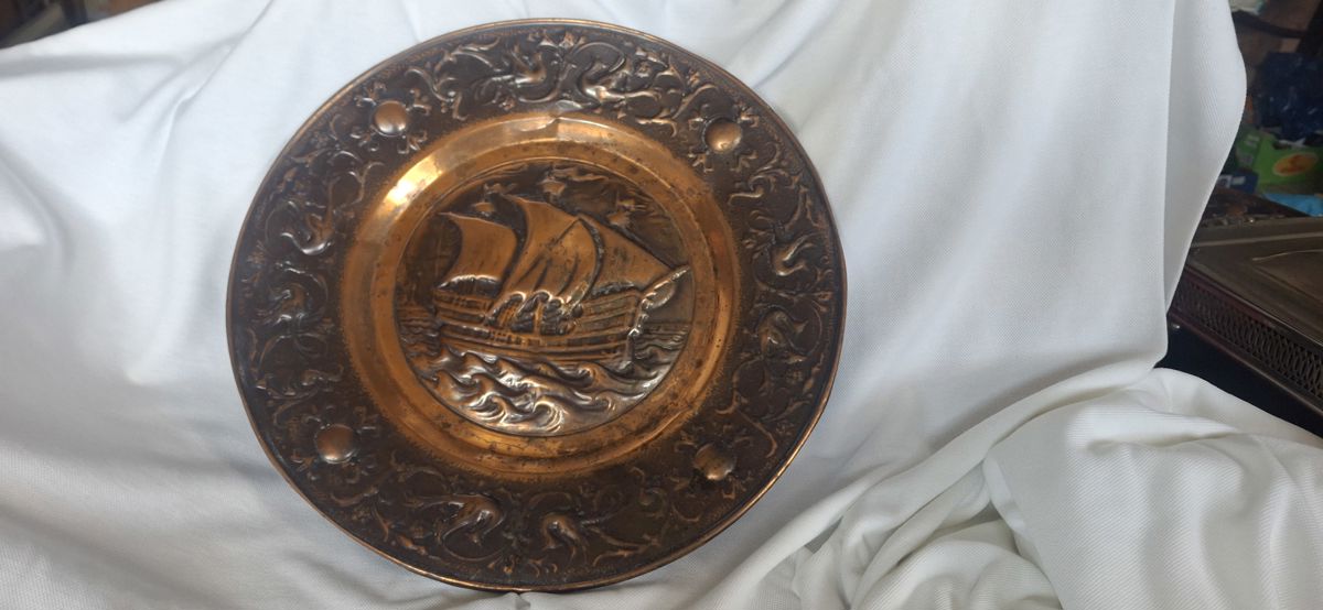Vintage Copper Decorative Wall Plate featuring a detailed ship design.