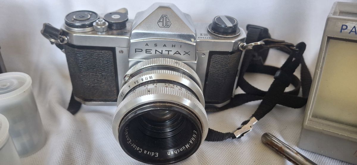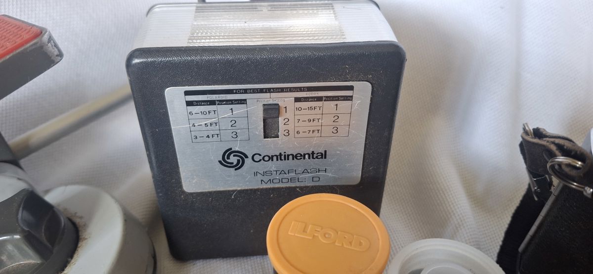 Accessories: Includes Continental Instaflash Model D, Paterson film viewer, camera leather cases, film canisters, film rolls, and various lens accessories