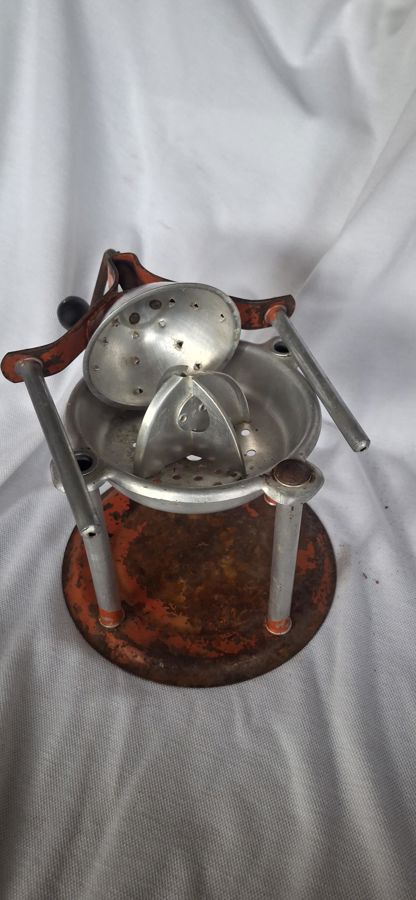 Vintage metal fruit juicer with a hand-crank mechanism.