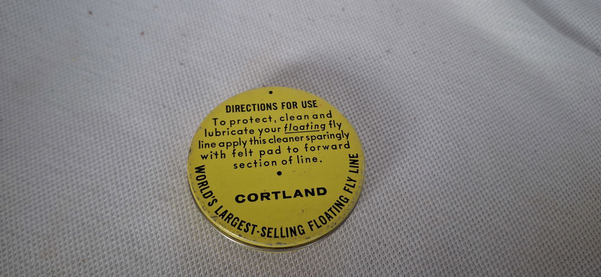 Vintage Cortland Fly Line Cleaner tin labeled with "Flote-Cote" added.