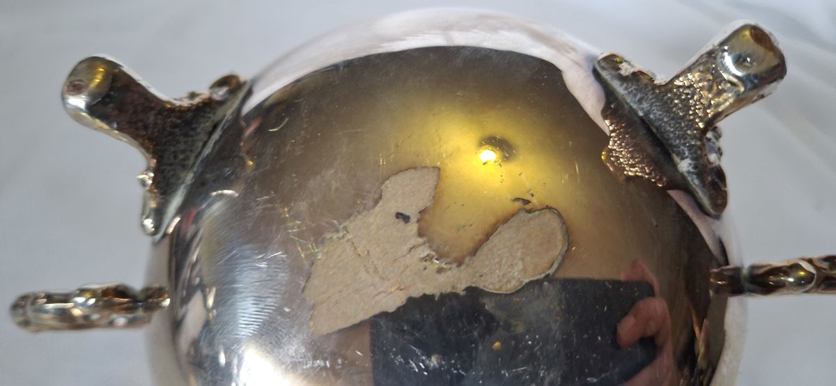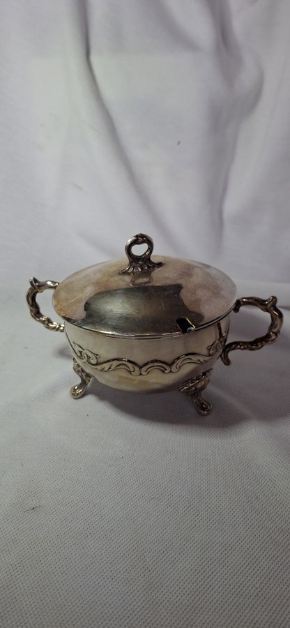 Silver-plated lidded sugar bowl with ornate handles and feet.