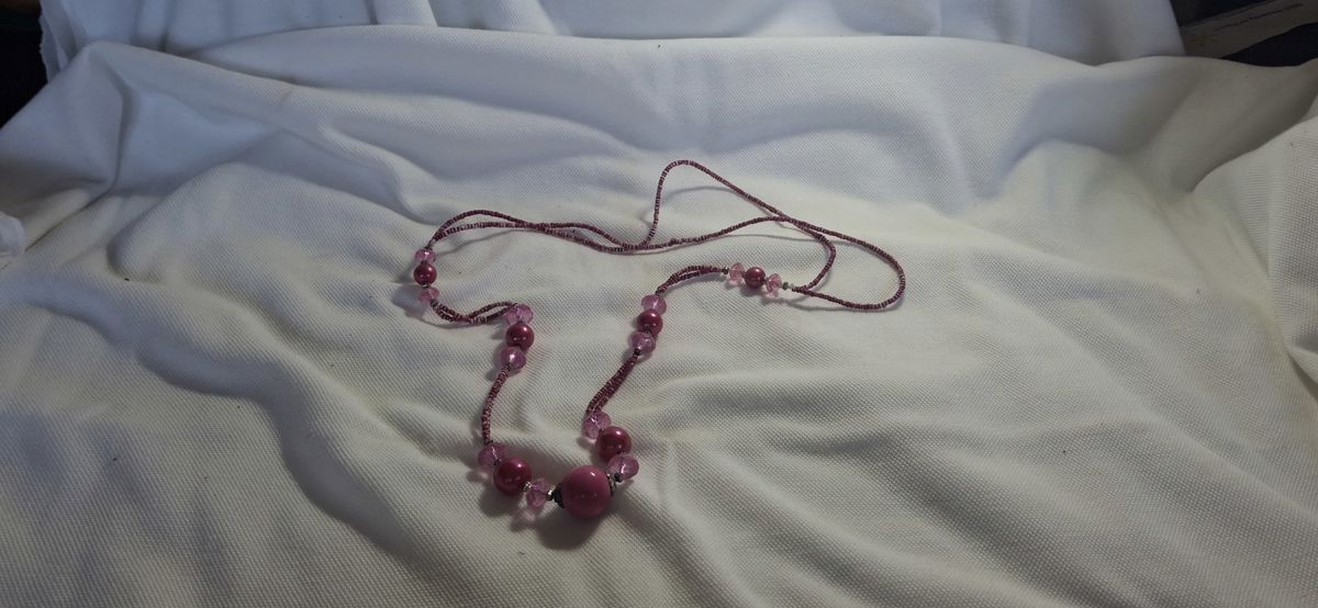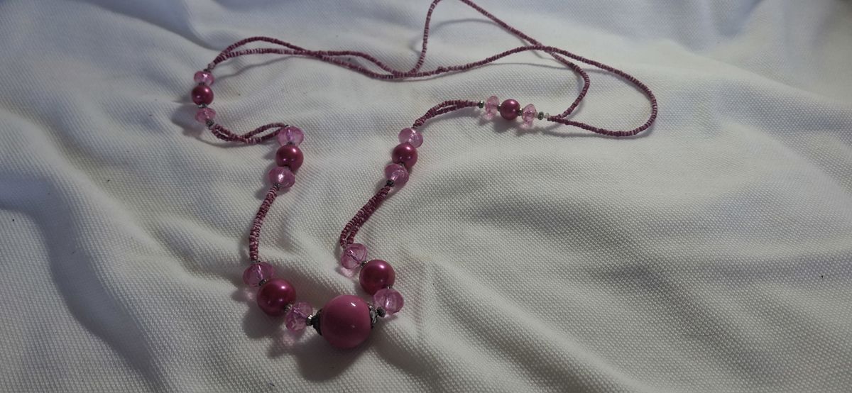 Pink beaded necklace featuring a combination of large and small pink beads.