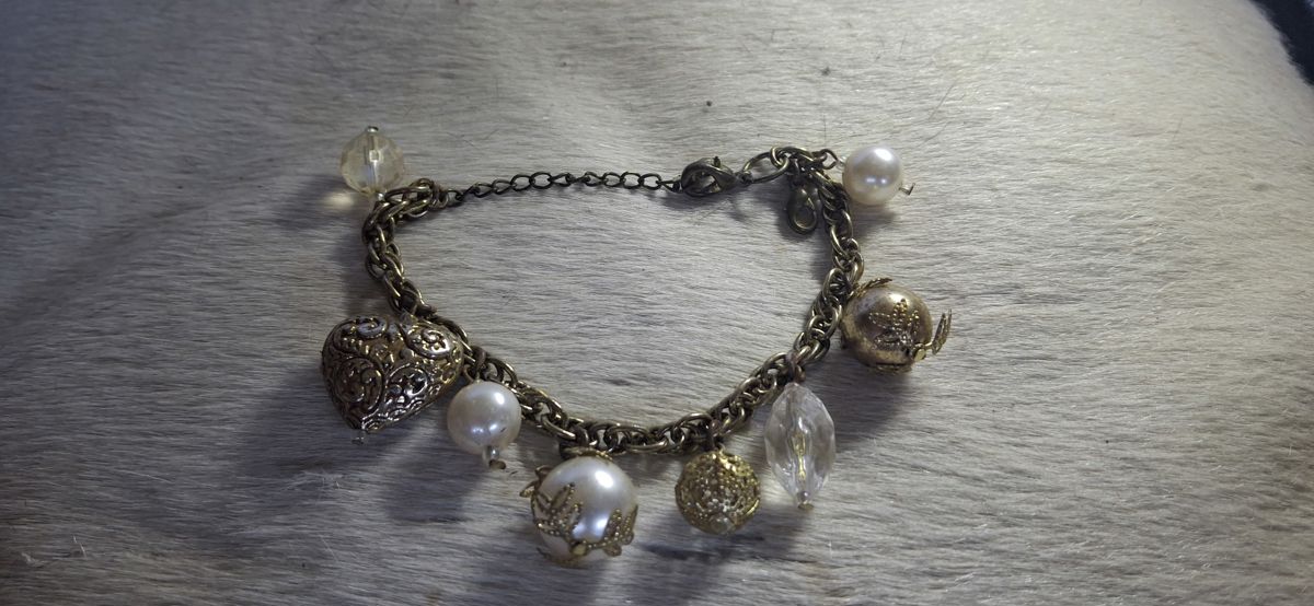 Vintage charm bracelet featuring a mix of ornate metal charms, faux pearls, and clear beads.