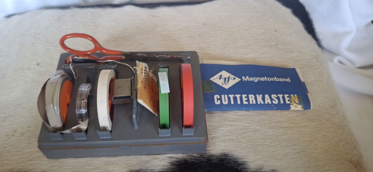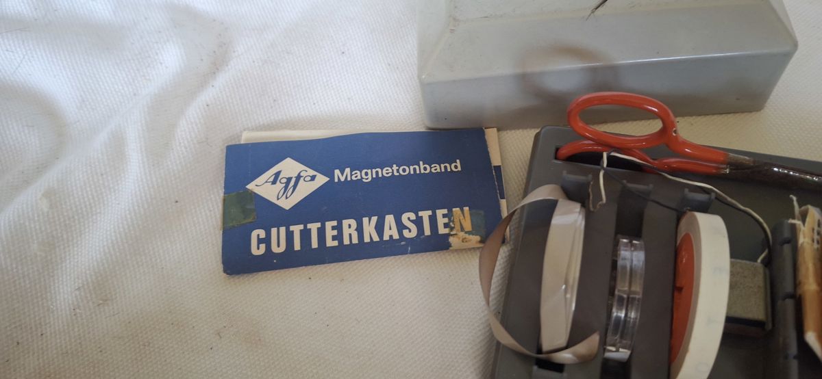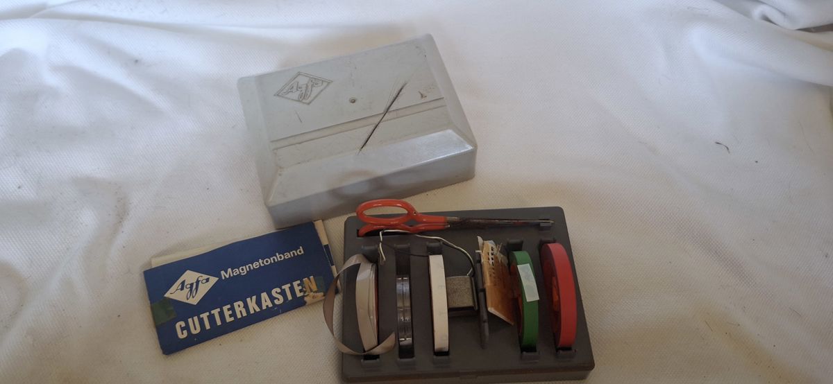 Agfa Magnetonband Cutter Set featuring a variety of magnetic tape rolls and a metal cutter box.