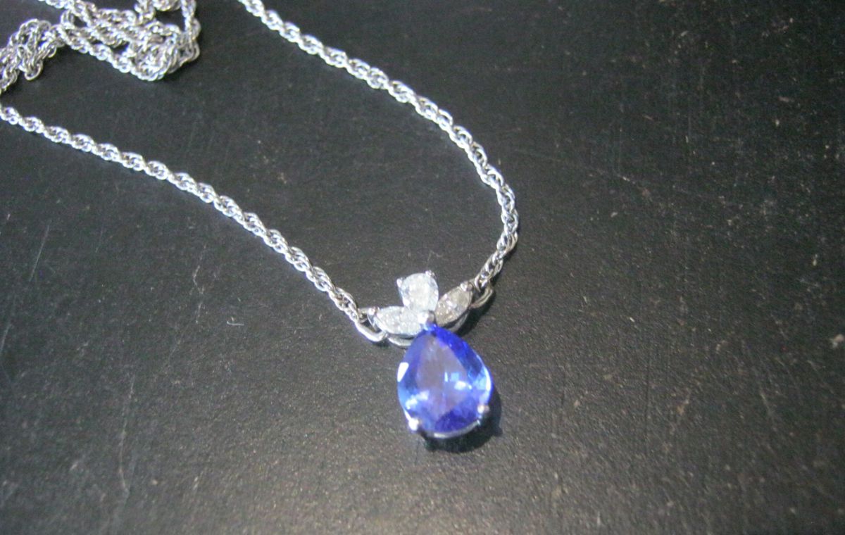 9CT GOLD NECKLACE WITH TANZANITE AND DIAMONDS, Pear-Cut Tanzanite 9mm Long, Pear-Cut Diamond 4mm Long, Oval Cut Diamonds 3mm Long, Weight