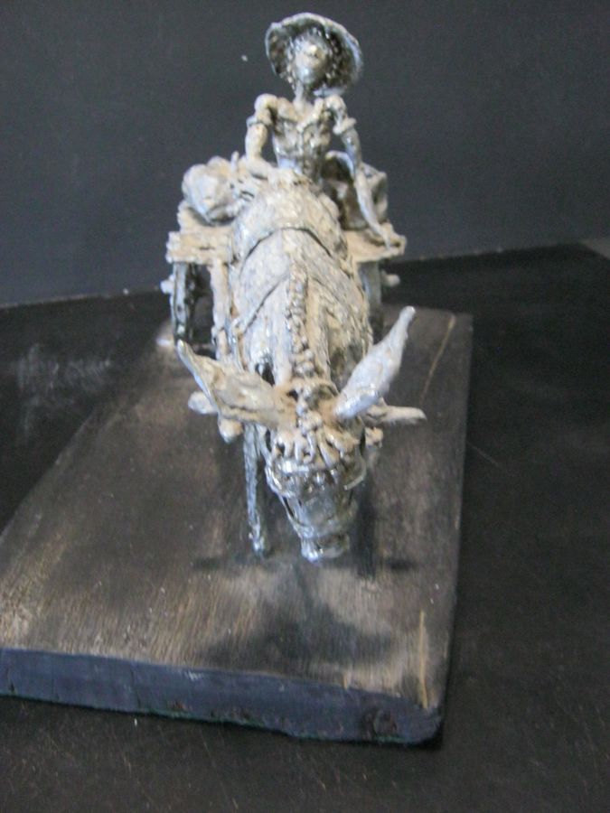 METAL DONKEY CART AND DRIVER GROUP ON WOODEN BASE, 33cm x 19cm, 21cm High