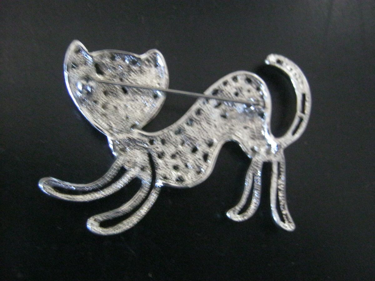 SILVER METAL CAT BROOCH SET WITH WHITE AND BLACK CRYSTALS, One Black Crystal Missing, 55mm Wide