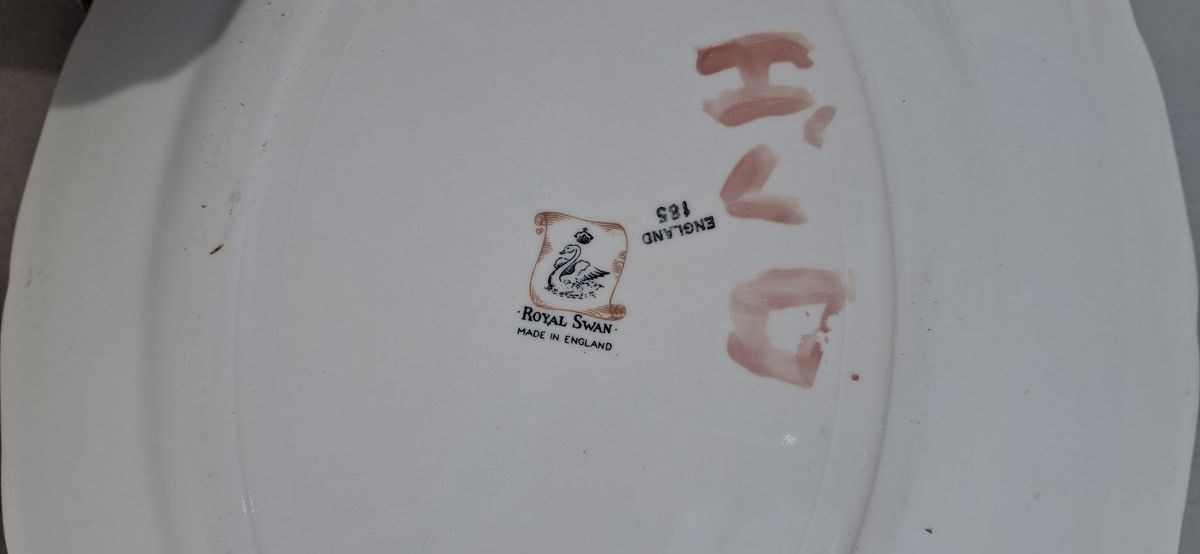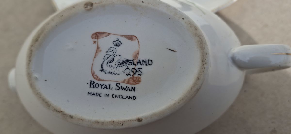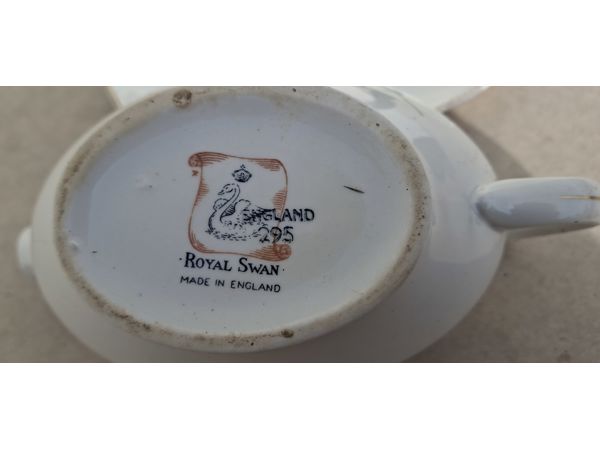 Royal Swan porcelain platter and gravy boat set with floral design.