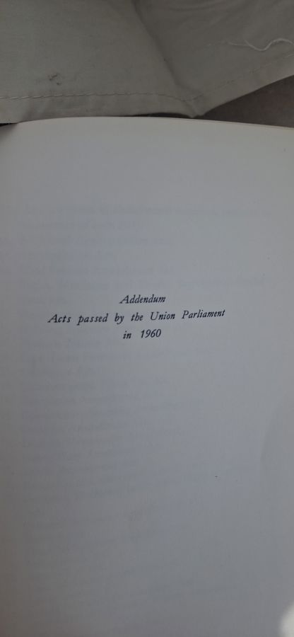 Condition: Noticeable stains on the cover and spine, with some wear consistent with age. Contains an addendum: "Acts passed by the Union Parliament in 1960."