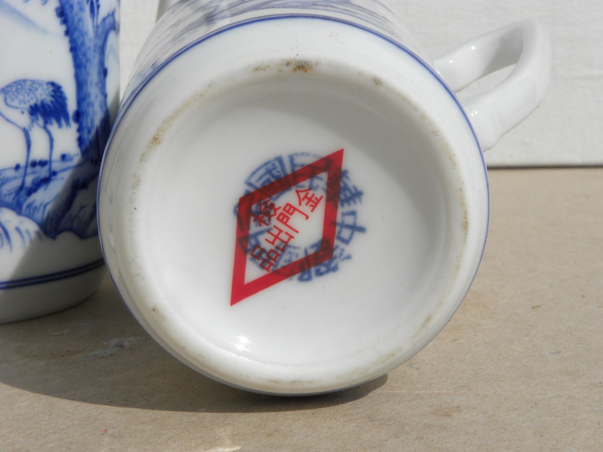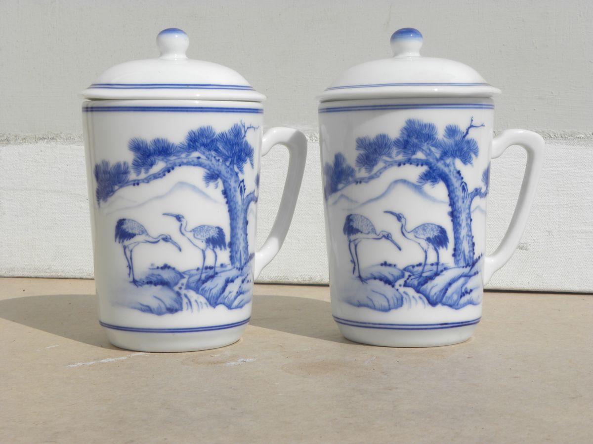 Pair of blue and white porcelain mugs with lids featuring crane and tree motifs.