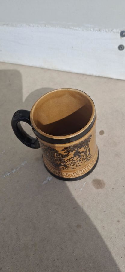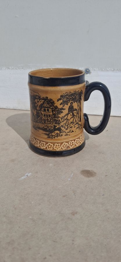 Vintage ceramic beer mug featuring a rustic tavern scene.