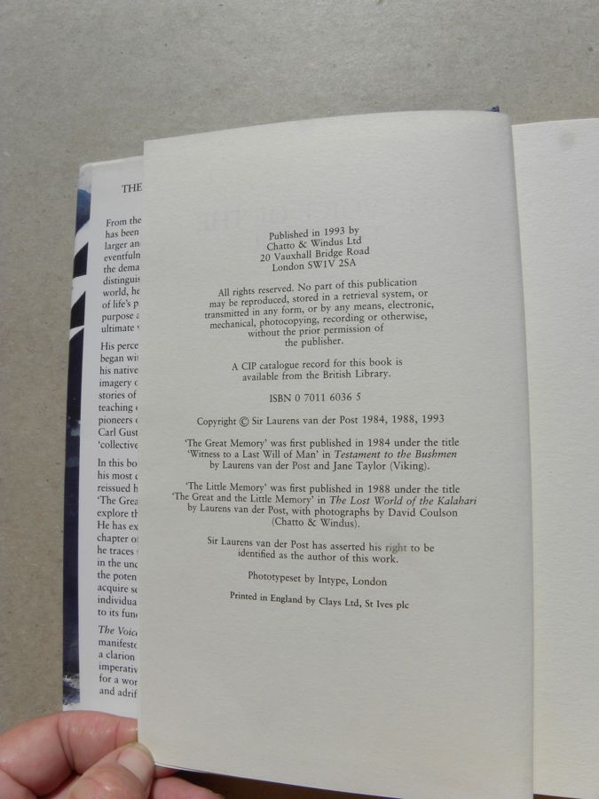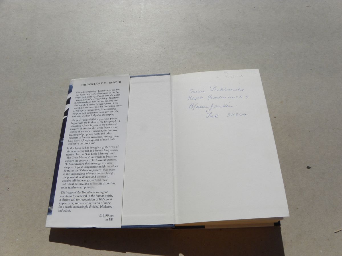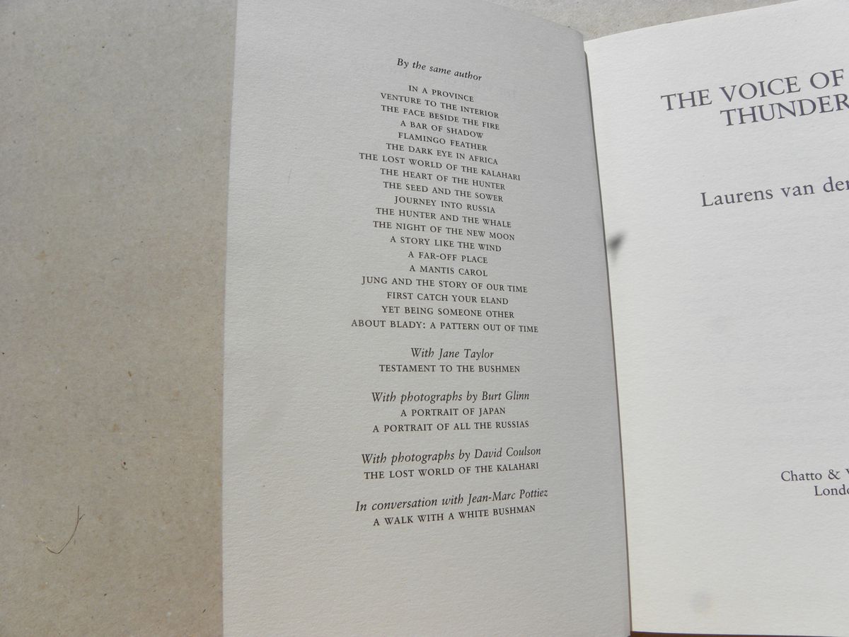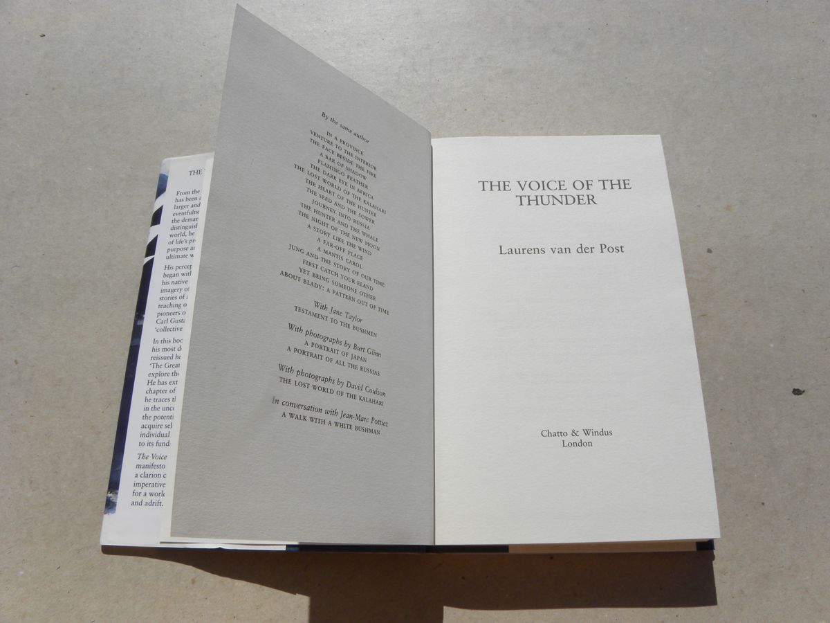 Hardcover copy of "The Voice of the Thunder" by Laurens van der Post, published in 1993 by Chatto & Windus.