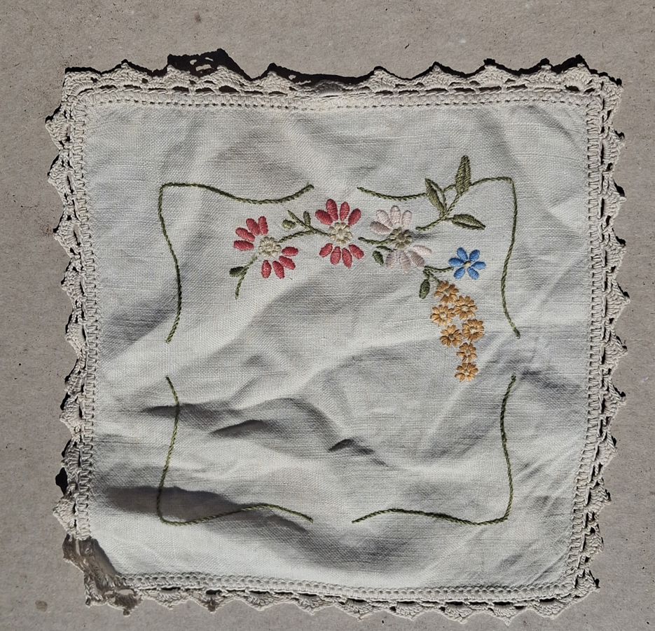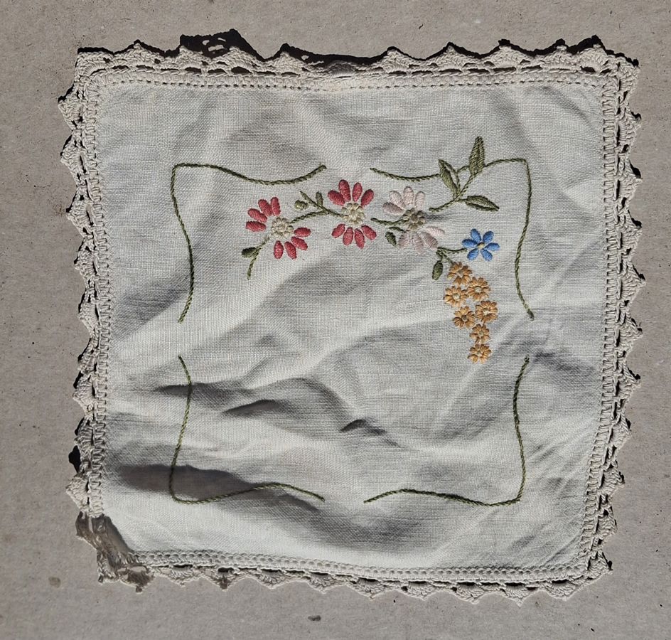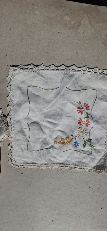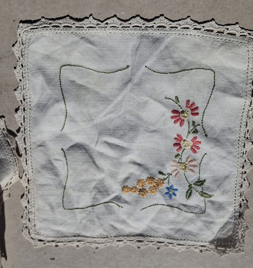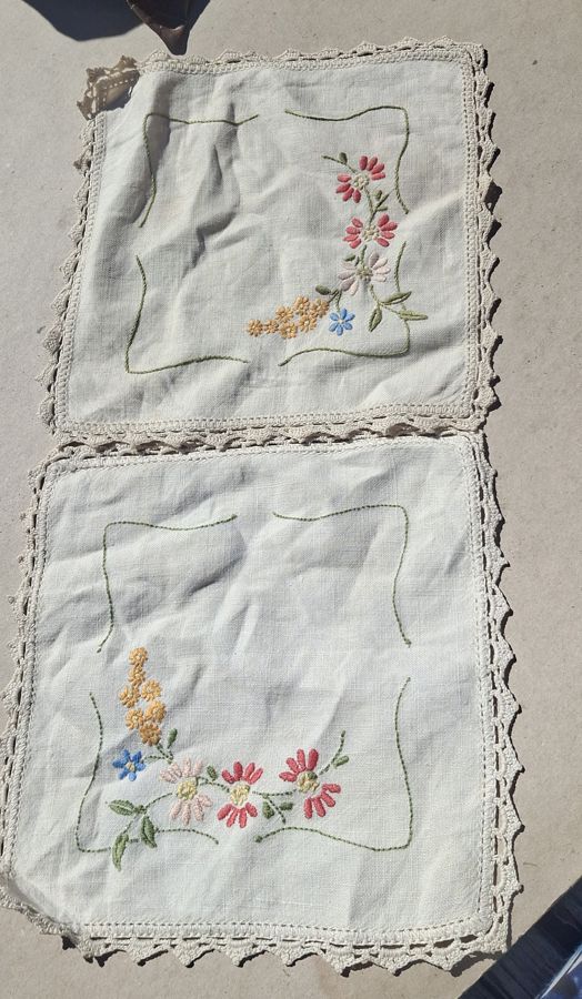 Pair of vintage embroidered linen doilies with floral designs and lace edges.
