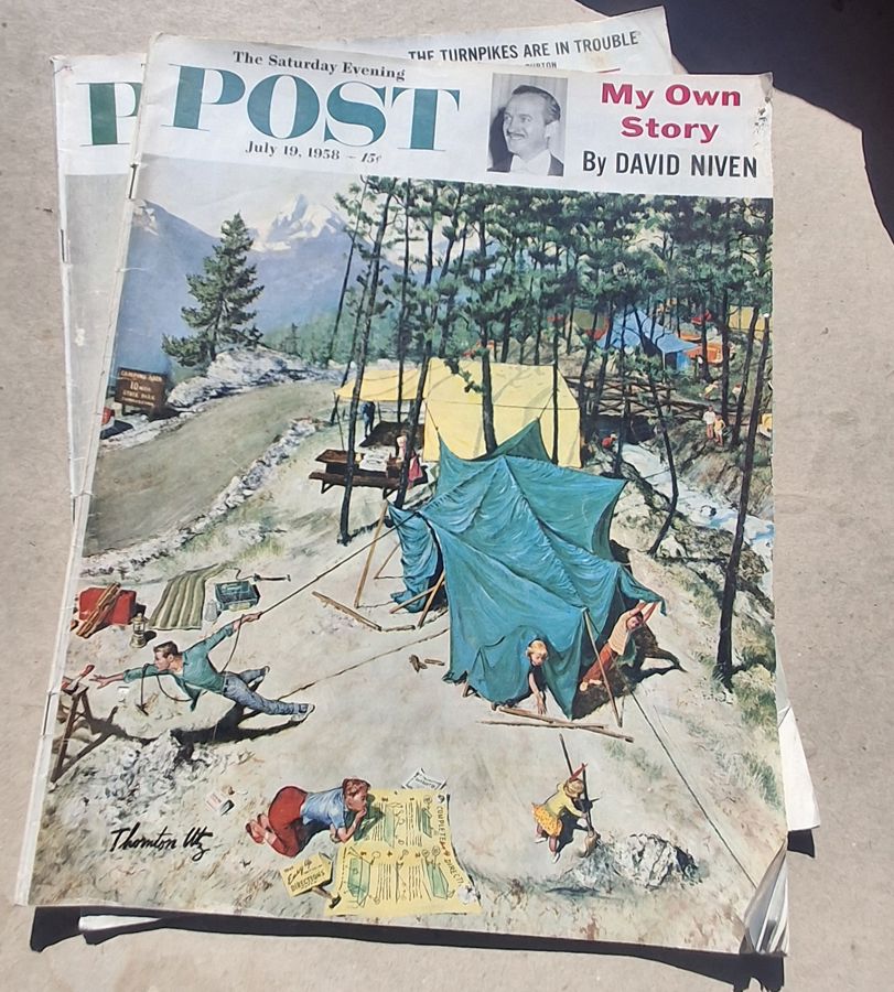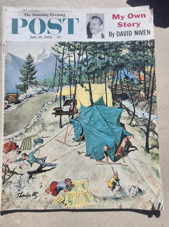 2. July 19, 1958, Cover by Thornton Utz, illustrating a camping scene titled "My Own Story" by David Niven.