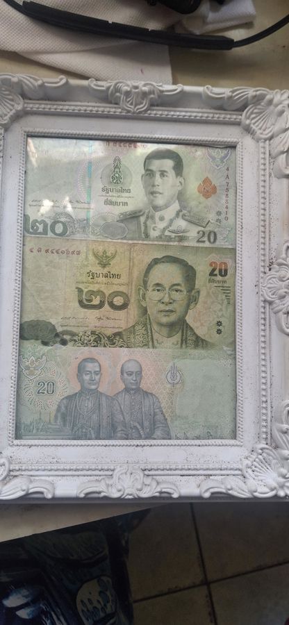 a Framed collection of several vintage 20 Baht banknotes from Thailand, featuring different historical issues.