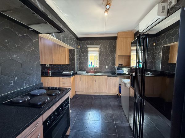 A well-proportioned kitchen with multi-functional cabinetry flows effortlessly into an open-plan living and dining area, featuring immaculate tiled floors, air-conditioning, and a striking modern fireplace. There's even enough space to create a second lounge or a dedicated work-from-home zone.