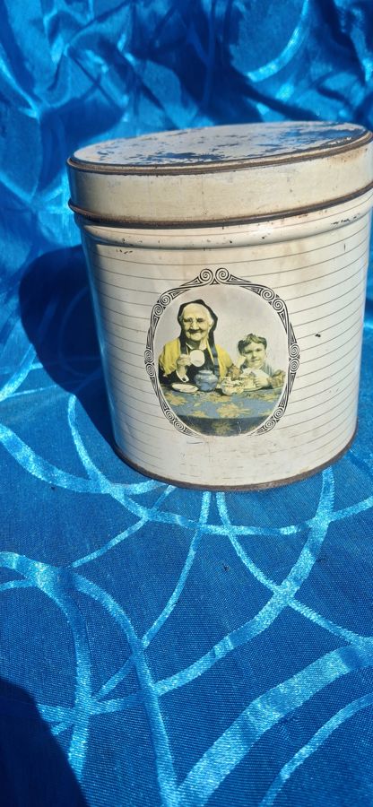 Vintage metal tea tin featuring an illustration of a family.