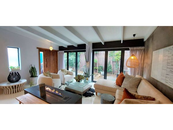 Lounge with a gas fireplace and stacking doors