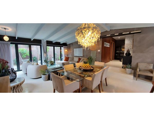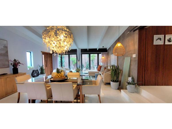 Dining room with Jacaranda leaves and crystals chandelier