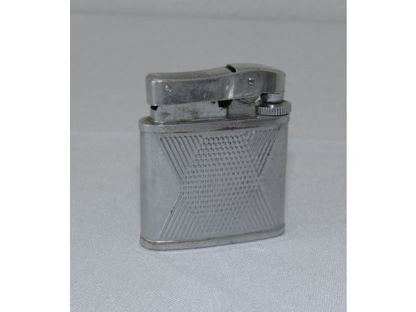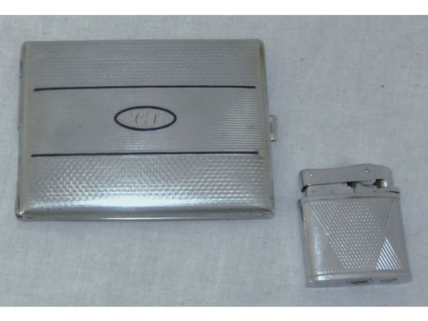 Art Deco style vintage machine tooled alpaca silver and blue enamel cigarette case with a vintage silver metal Brother Lite gas lighter. - Some wear to both consistent with age and use, lighter needs gas and flint.