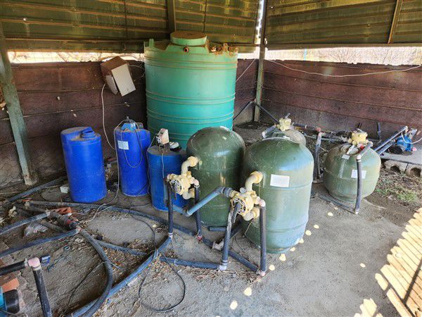 4 x boreholes, 2 x concrete dams, 8 x Plastic storage tanks, Water treatment plant.