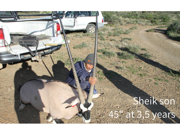 | Comment | : Beautiful, big bodied, DNA approved daughter of Sheik with perfect horn shape. Produced her first calf at the age of 27 months. Sheik, originally from Namibia, was one of the top breeding bulls in SA, producing numerous cows above 44" and bulls above 45". Top oryx genetics on offer! |
