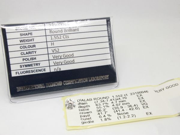 Round brillaint cut. 1,552cts. Colour H. Clarity VS2